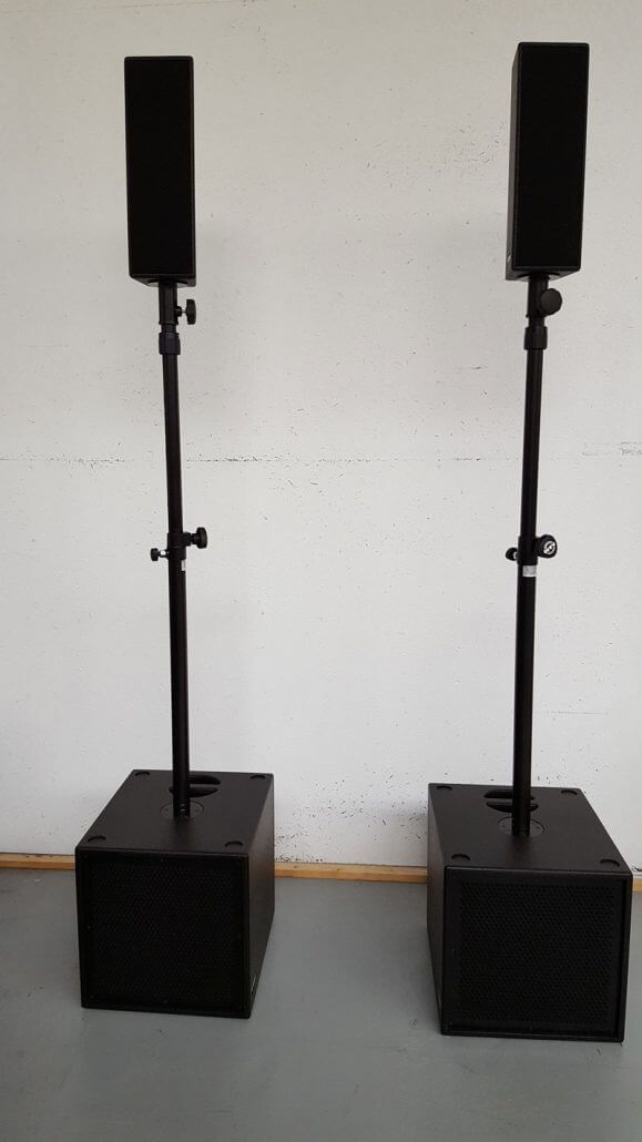 Alleinunterhalter, DJs und Medienschaffende können die T 4 Säule in Verbindung mit unserem Mico Sat Bass einsetzen. Es können maximal zwei T4-Säulen über einen speziellen L-Bügel adaptiert werden.